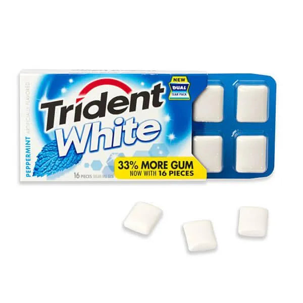 Box includes 9 blister packs, each containing 16 pieces of Trident Peppermint Gum....with 2-Way Whitening Power!
