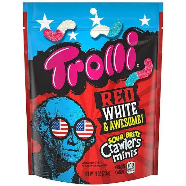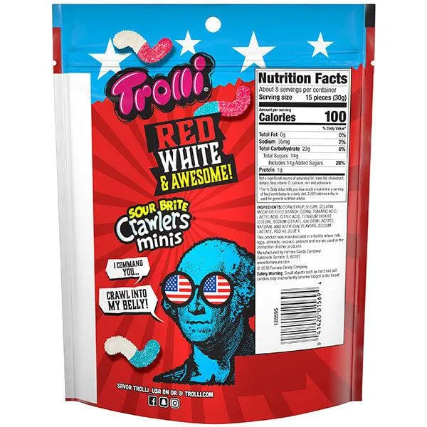 Bag contains 9 ounces of Red, White, and Awesome Trolli Sour Brite Crawlers Minis Gummy Worms Candy.