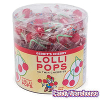 Tub contains 48 Twin Cherry Hard Candy Lollipops.