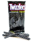 Case contains 5 pounds of Black Licorice Twizzlers Candy Twists packed in 12 bags, each with a net weight of 7 ounces.