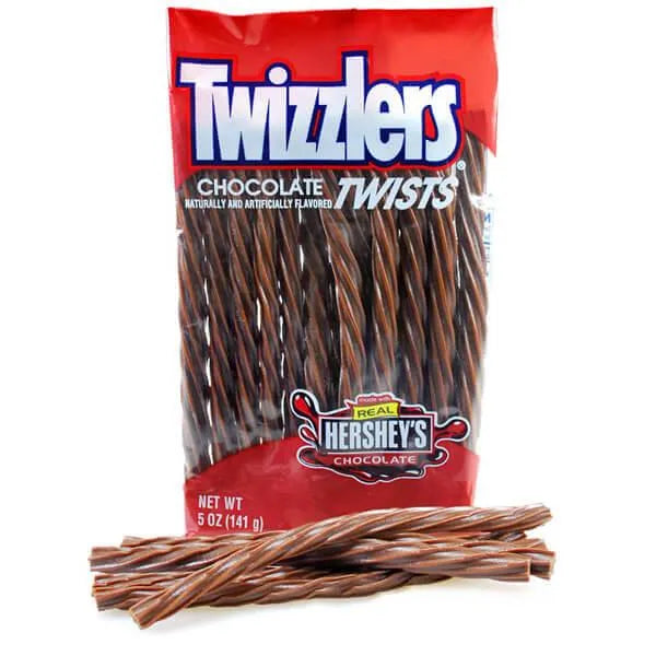 Case contains 3.75 pounds of Brown Chocolate Twizzlers Candy Twists packed in 12 bags, each with a net weight of 5 ounces.