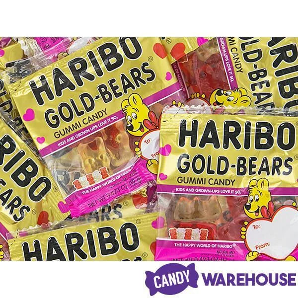 Bag contains 40 snack packs of Valentine Haribo Wild Berry Gold-Bears Gummi Candy.