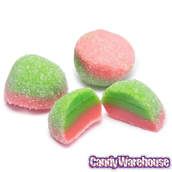 Plump gummy mounds featuring the flavor of juicy watermelons! Perfect for your candy dish, these chewy gummy watermelon domes are tender and delicious with layered colors of pink and green.