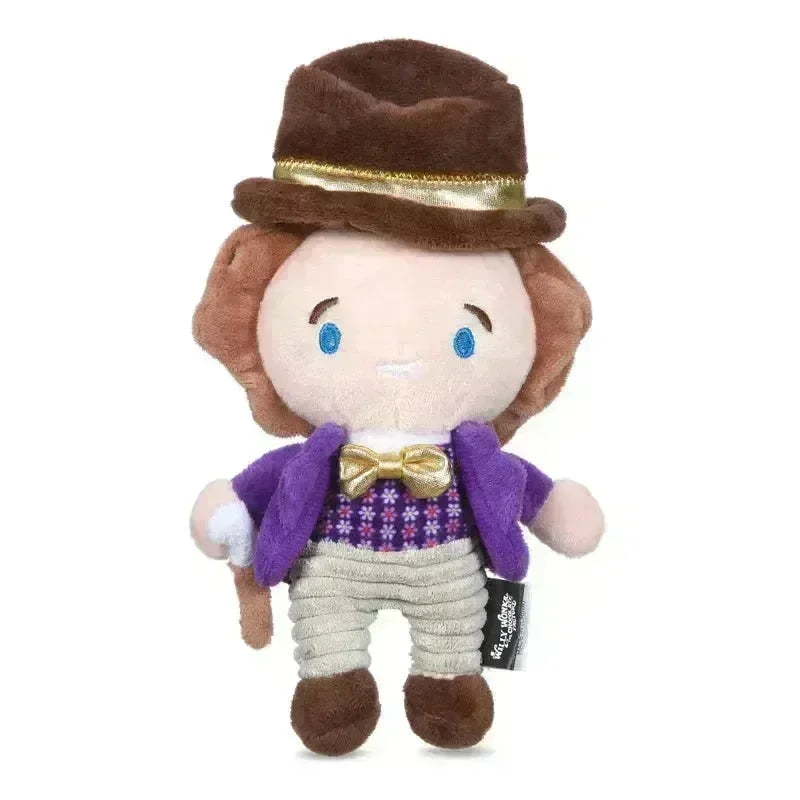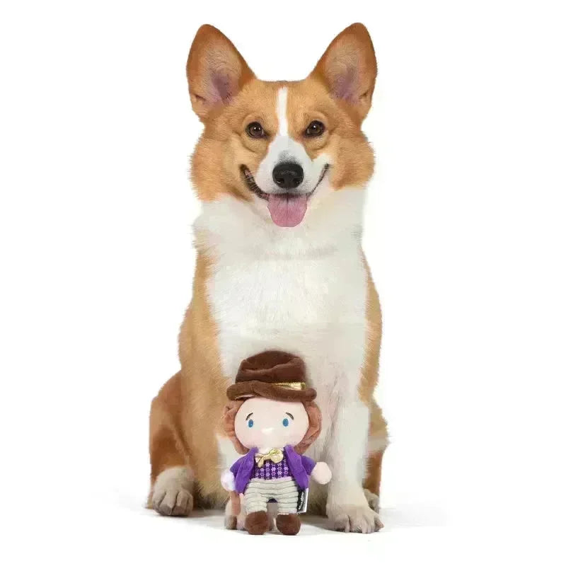 Your dog will feel like they've won the Golden Ticket when you bring home a Willy Wonka plush squeaker toy! Inspired by characters and iconic scenes straight from the film, our line of Willy Wonka pet toys will bring the same sense of wonderment and frivolity that generations of fans have enjoyed from this beloved film. The Willy Wonka 6โ Plush Squeaker Dog Toy features everyoneโs favorite Candy Man, complete with top hat and cane. From his velvet hat and jacket with metallic trim to his corduroy pants and faux fur hair, our Willy Wonka plush for dogs is a textural playground for pups! This plush dog toy measures 6 inches tall and includes an internal squeaker your dog will love. Best for light chewers, these toys are perfect to cuddle, toss, and roll around with! No hard plastic, sharp corners, or edges, this Willy Wonka gift toy for dogs has all embroidered or screen-printed details.