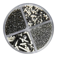 Great for New Year's Eve, elegant bridal and baby showers, birthdays and more, this sprinkles mix is a fun way to add color and texture to your desserts. This mix of sprinkles contains white, black and silver nonpareils; silver metallic sprinkles; black and white jimmies; and black metallic sprinkles. Try them on cookies, cupcakes, brownies, even ice cream! Each variety of sprinkle is packaged individually with its own lid, so you can use one at a time or mix and match sprinkles for a fun look.