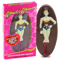 Wonder Woman's origin story relates that she was sculpted from clay by her mother Queen Hippolyta, and given life along with superhuman powers as gifts by the Greek Gods. She possesses an arsenal of advanced technology, including the Lasso of Truth, a pair of indestructible bracelets, a tiara which serves as a projectile, and an invisible jet. In this unique rendition of Wonder Woman, she is sculpted entirely of delicious chocolate, making her even more wonderful. She is the perfect gift for any superhero woman in your life.