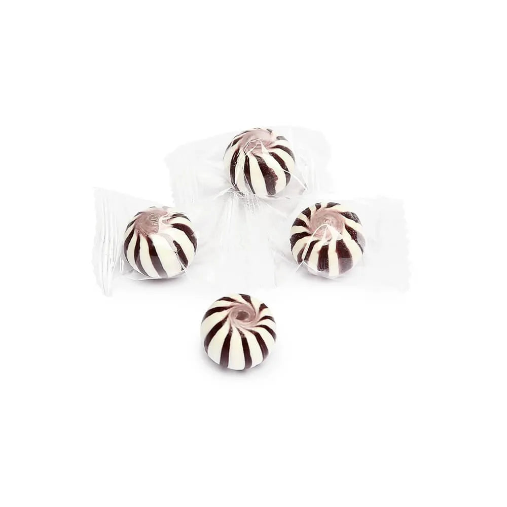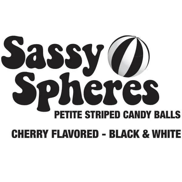 Bag contains 5 pounds of Black Sassy Spheres Petite Striped Candy Balls.