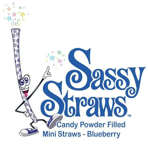 Box contains 700 Sassy Straws Blueberry Candy Powder Filled Mini Straws.