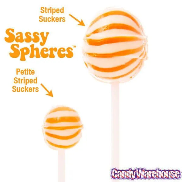 Bag contains 400 individually wrapped Orange Sassy Suckers Petite Striped Ball Lollipops.