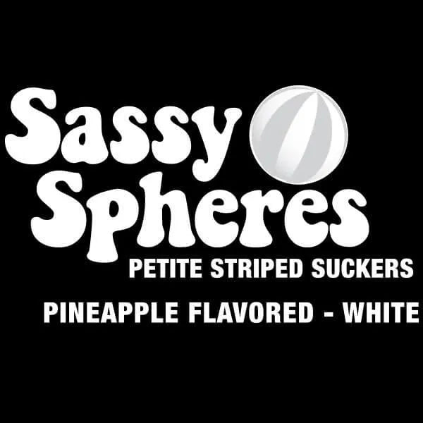 Bag contains 400 individually wrapped White Sassy Suckers Petite Striped Ball Lollipops.